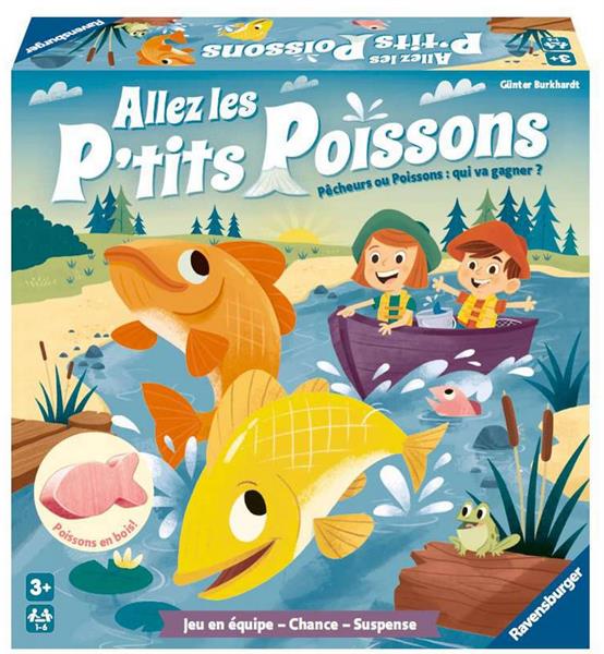 Il y a beaucoup d'agitation dans la rivière : les pêcheurs et les poissons font la course ! Lancez le dé et faites avancer d'une case soit le poisson de la couleur correspondante, soit le bateau avec les pêcheurs. Si les poissons atteignent la mer, ils sont sauvés ! Mais attention à ne pas se faire rattraper par les pêcheurs. En fin de partie, s'il y a plus de poissons sauvés que de poissons attrapés, l'équipe des poissons remporte la partie. Il faudra parfois faire un choix crucial !Allez les P'tits Poissons est un jeu de course dans la même collection que le célèbre jeu de course Allez les Escargots. Les règles sont simplissimes et s'apprennent en quelques secondes seulement ! Une fois le matériel installé sur la table, toute la famille est prête à jouer. Ce jeu permet d'initier en douceur les enfants aux premiers jeux de société. Après quelques parties et une fois que les enfants sont à l'aise avec le matériel de jeu, ils sont même capables de jouer seuls sans avoir besoin d'un adulte !