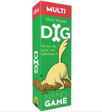 Dans DIG, chaque joueur est un chien qui courra à travers la cour, déterrera des os et tentera de les remettre dans la gamelle pour chien de couleur assortie avec la plus grande efficacité. Tous les joueurs marqueront une fois, à la fin de la partie, en fonction de la valeur cumulée des os qu'ils ont remis dans les gamelles correspondantes.