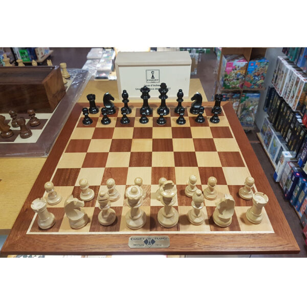 Jeu d’échec composé d’un plateau en bois massif et de pièces en bois plombées feutrées.