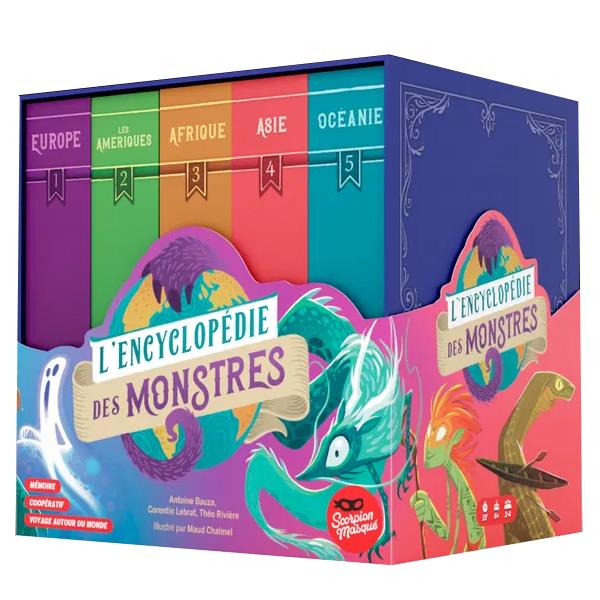 L’Encyclopédie des Monstres se présente sous forme de 5 tomes colorés - comme une vraie encyclopédie, représentant les 5 continents du monde. Chaque tome contient tout le matériel nécessaire pour visiter 3 pays différents. Chaque pays propose une nouvelle façon de jouer, avec ses propres défis, règles et monstres.