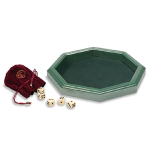 Piste octogonale en bois massif (Ayous) teinté vert, sac en tissu avec 5 dés classiques et 5 dés de poker (18mm).