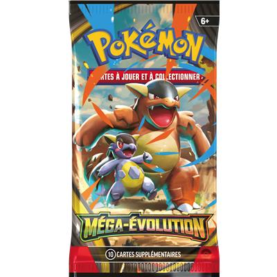 Chaque booster de l'extension Méga-Évolution du JCC Pokémon contient 10 cartes, 1 énergie de base ou 1 carte à code pour le JCC Pokémon Live.