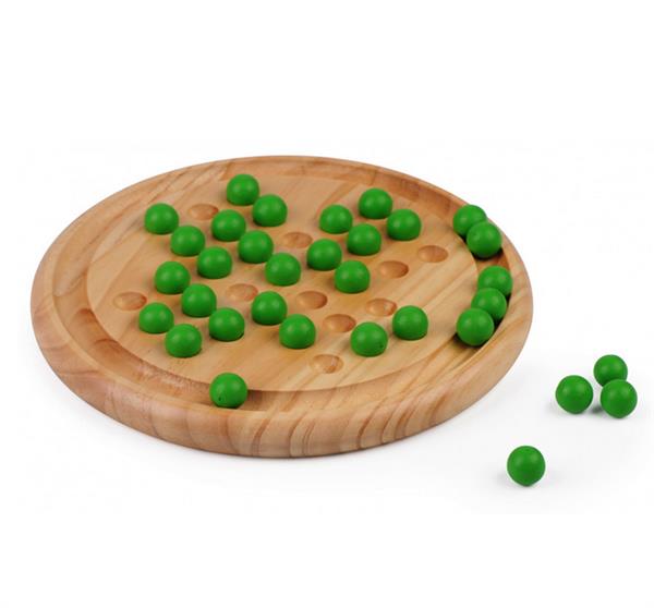 Solitaire en bois (pin), diamètre 22.5cm. Billes en bois peintes (vert).